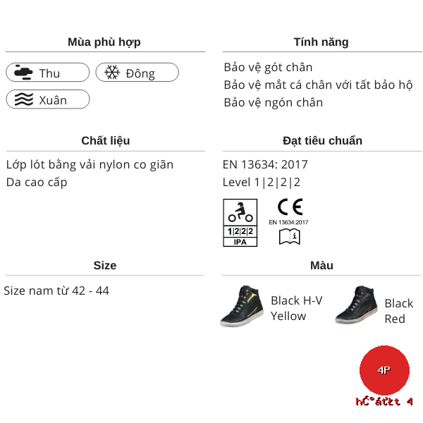 Giày LS2 Zoe Man được đánh giá cao về độ an toàn, được chứng nhận đạt tiêu chuẩn an toàn của Liên minh châu Âu (CE): EN 13634: 2017, Level 1|2|2|2.