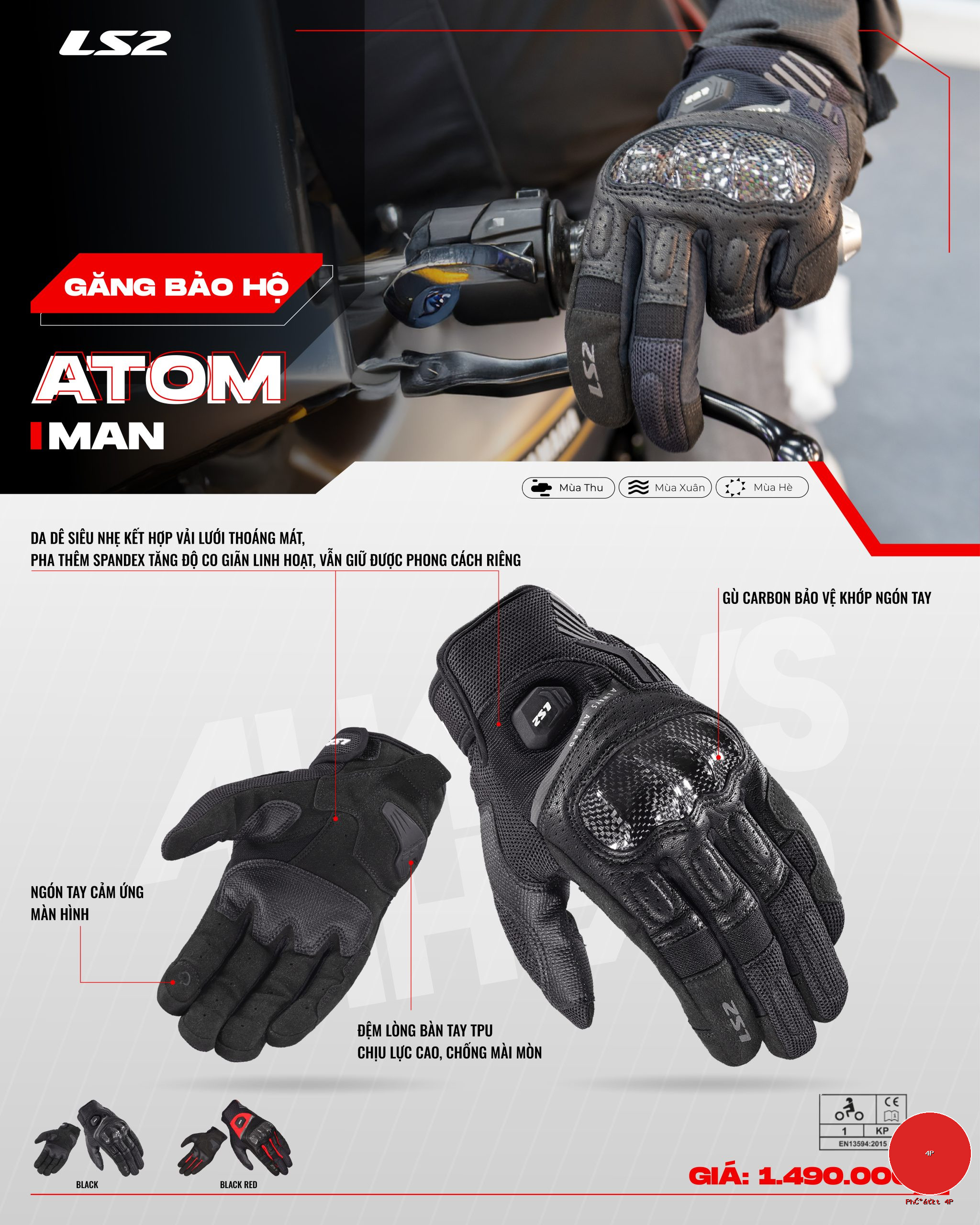 LS2 Atom Man hướng tới người dùng thường xuyên di chuyển trong thời tiết nóng, cần găng tay thoáng, nhẹ, linh hoạt nhưng vẫn bảo vệ chuẩn.