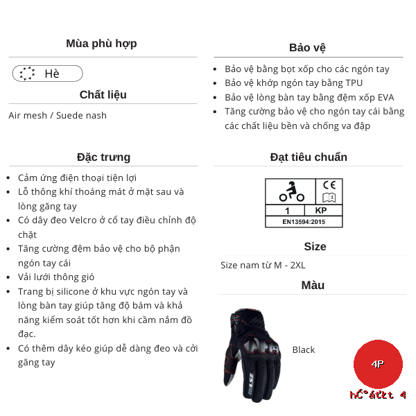 Thoáng khí: Găng tay được thiết kế với các lỗ thông hơi ở lòng bàn tay và mặt sau của tay, giúp thông gió tốt, hạn chế mồ hôi tay và giúp tay luôn khô ráo, thoáng mát.
