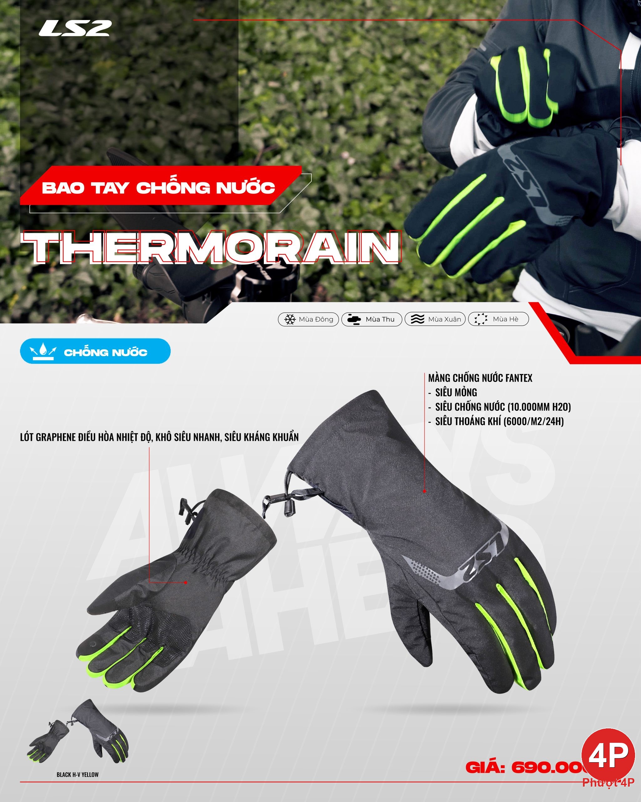 Sản phẩm mới hoàn toàn của LS2, nhiều tính năng vượt trội. Thermorain hướng tới riders muốn găng tay thoáng khí nhưng đi mưa ướt, mà găng chống nước thì đi bình thường bị nóng, Thermorain có thể giải quyết toàn vẹn toàn hai vấn đề.