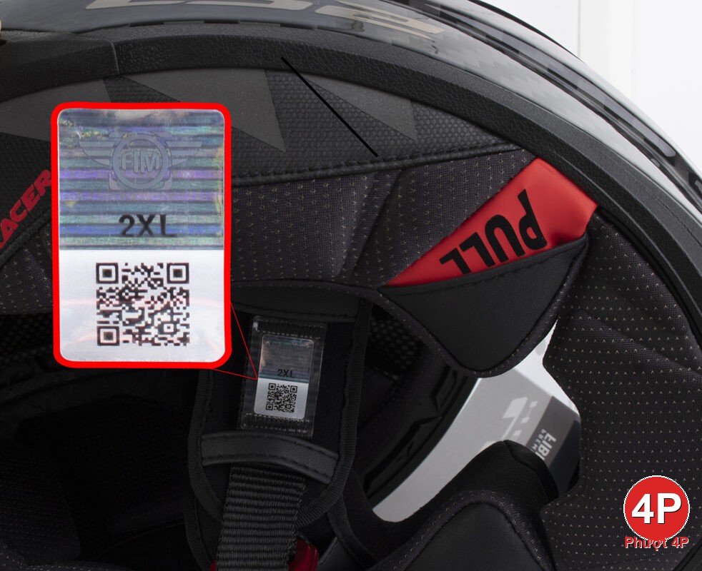 Trên phần dây quai của mỗi chiếc mũ bản FIM đều có gắn tem 3D QRcode dẫn về webste Tổ chức FIM thể hiện thông số kỹ thuật và chứng nhận mũ đạt chuẩn
