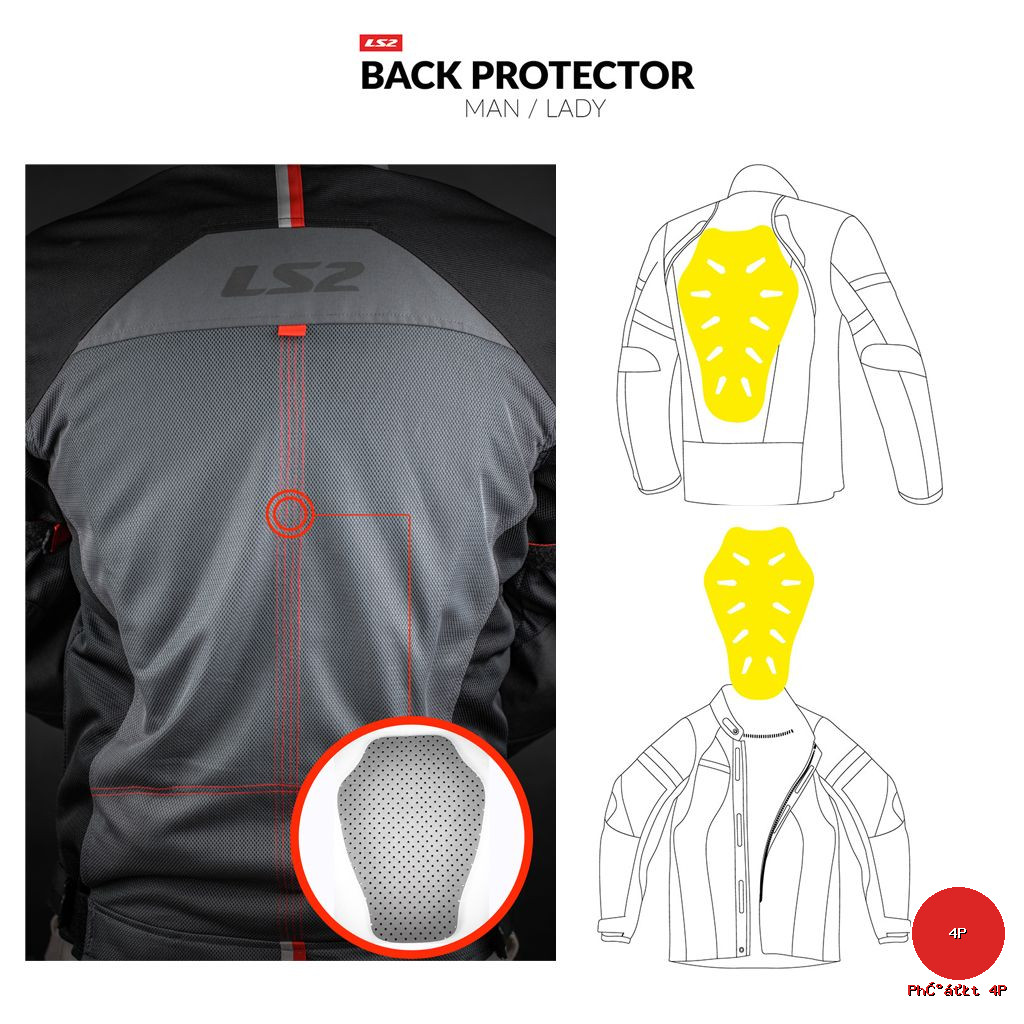 + Lớp đệm lưng bằng hợp chất Viscoplex, cao cấp hơn so với nhựa PU thông thường, có khả năng chống nước, chịu lực tốt hơn, chống hao mòn, có thể tháo rời dễ dàng, tiện lợi cho việc vệ sinh. Đệm lưng mặc định có 2 kích cỡ, cỡ nhỏ dùng cho size: S, M, L, cỡ lớn dùng cho size XL và XXL.Ngoài ra người dùng có thể thay thế bằng giáp lưng rời của hãng LS2.